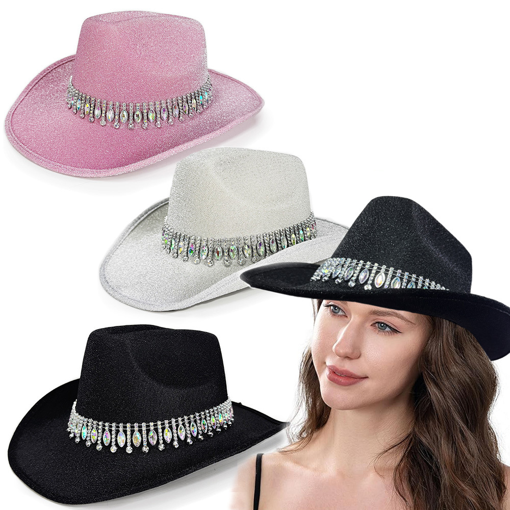 スポットグリッターレインドロップリムピンクウエスタンカウボーイハットブライダルパーティーシャイニーシルクハットナイトクラブカーニバルハット