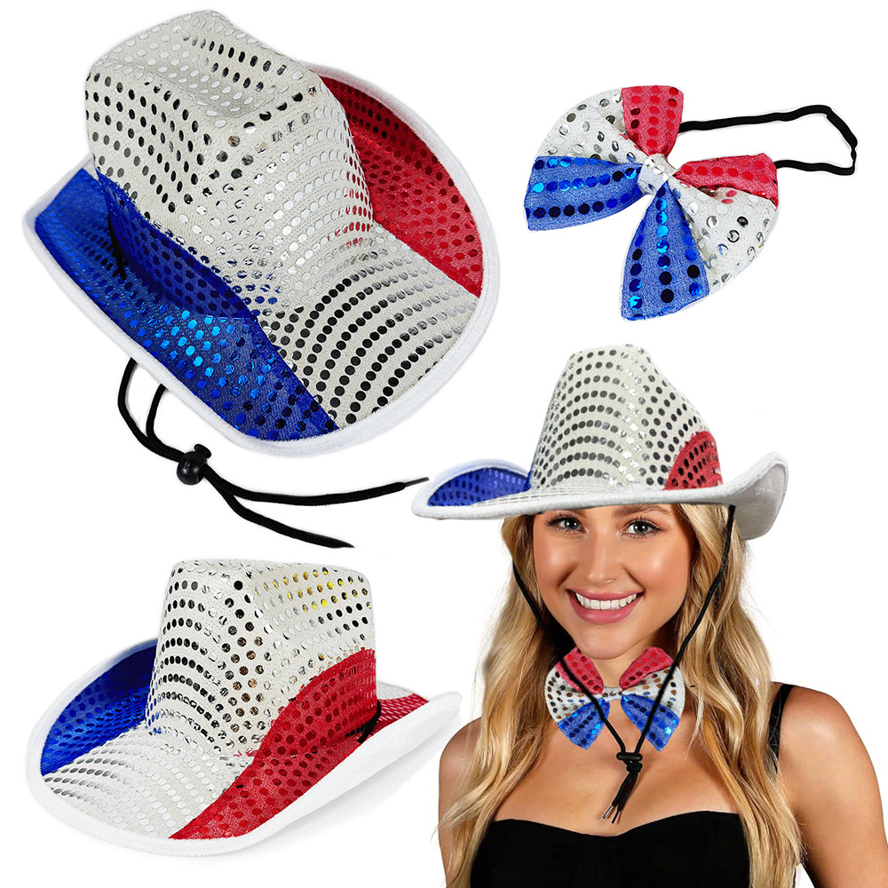 スポットアメリカ独立記念日赤白と青のスパンコール付きカウボーイハットカーニバルパーティー赤白と青の蝶ネクタイハットセット