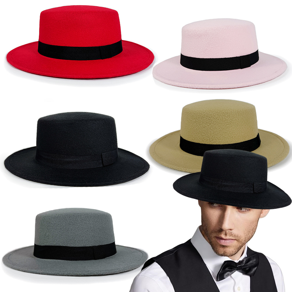 男性と女性のための新しい秋と冬のウールの帽子英国スタイルの平底模造ウールピンクスクエアノットウェビングジャズハット