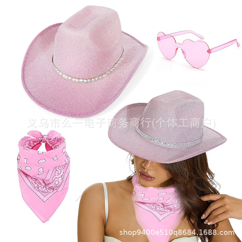 現物西部毛辺カウボーイ帽眼鏡角巾三点セットピンク羽辺包辺カウボーイ帽三点セット