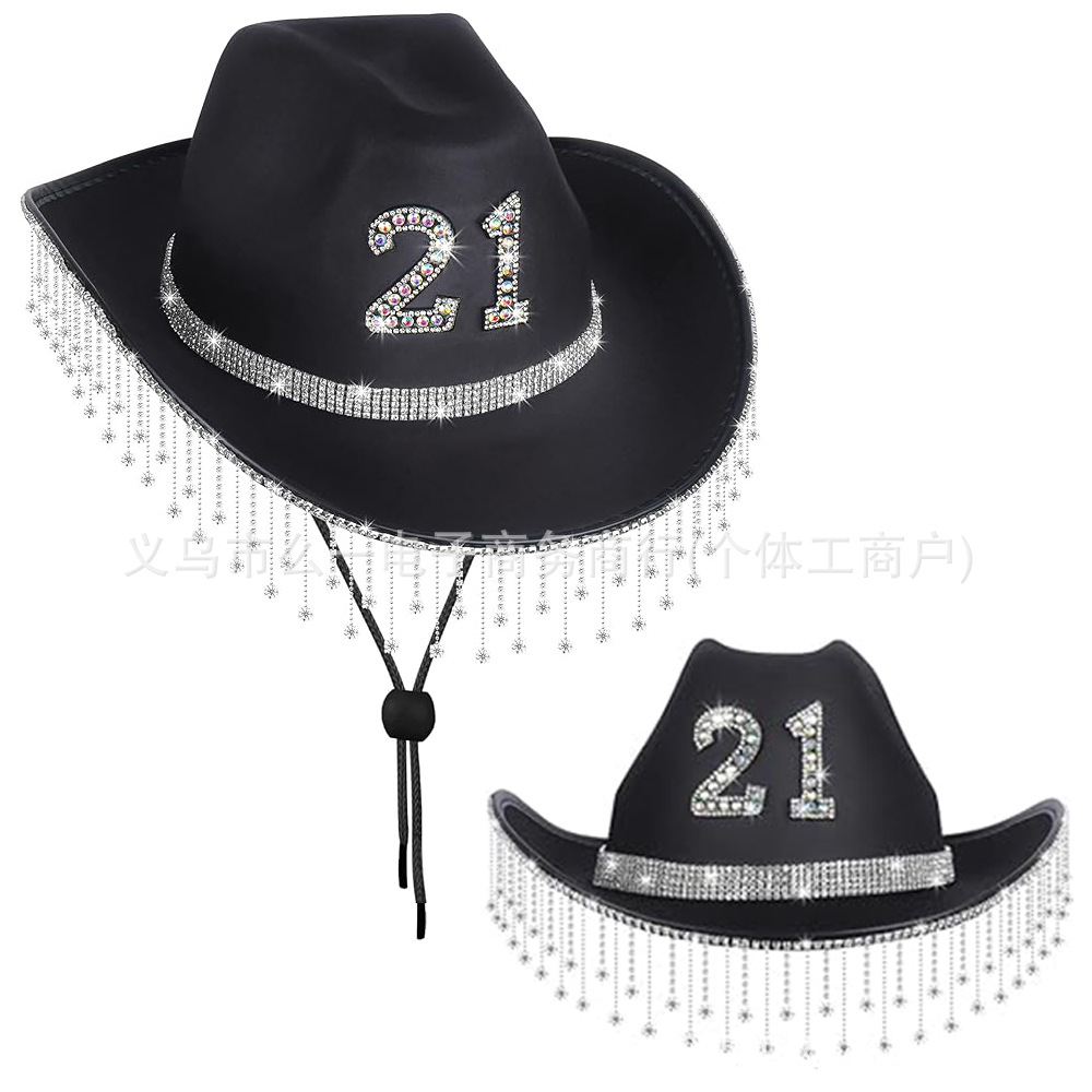 新型アマゾンの21歳の誕生日カラードリルの黒いドリルのフリンジカウボーイ帽の誕生日パーティーの水ドリルの縁の帽子