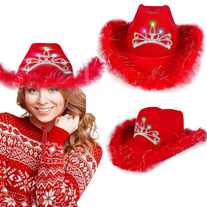 スポットクリスマス赤いランプ付きクラウンカウボーイ帽西部カウボーイ羽辺発光礼帽カーニバル帽