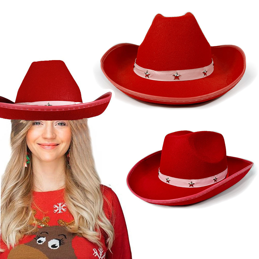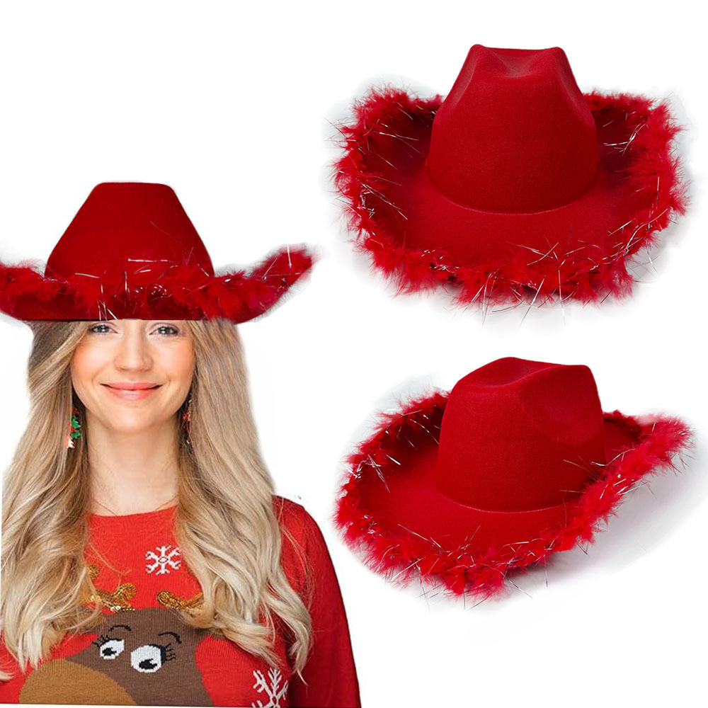 現物クリスマス赤い毛の縁のカウボーイ帽西部のカウボーイの羽の辺の礼帽のカーニバルのパーティーの定型帽子