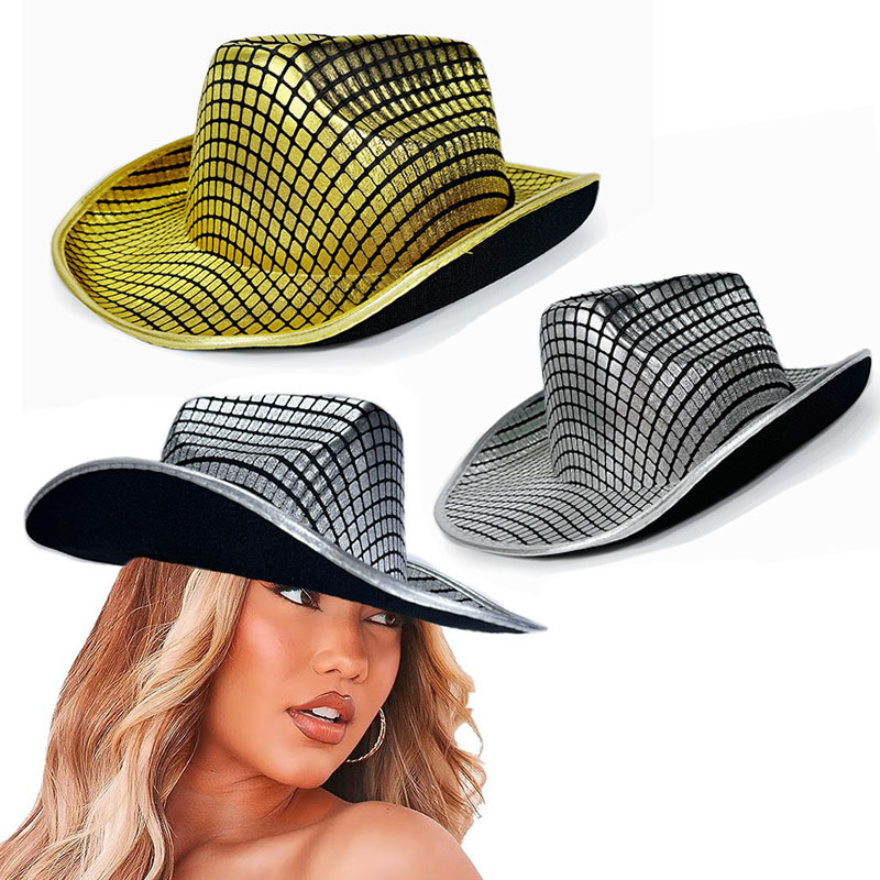現物ハロウィーンの金箔の金色のディスクの明るい帽子の新しいカーニバルのパーティーのまぶしい銀色のディックのカウボーイの帽子