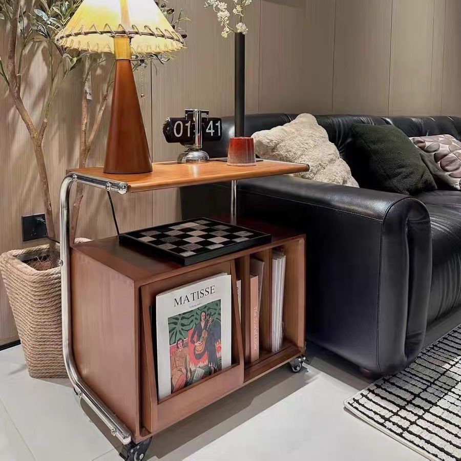 中古可動トロリーソファサイドテーブルリビングルームレトロ無垢材コーヒーテーブル雑誌本棚ベッドサイド収納棚