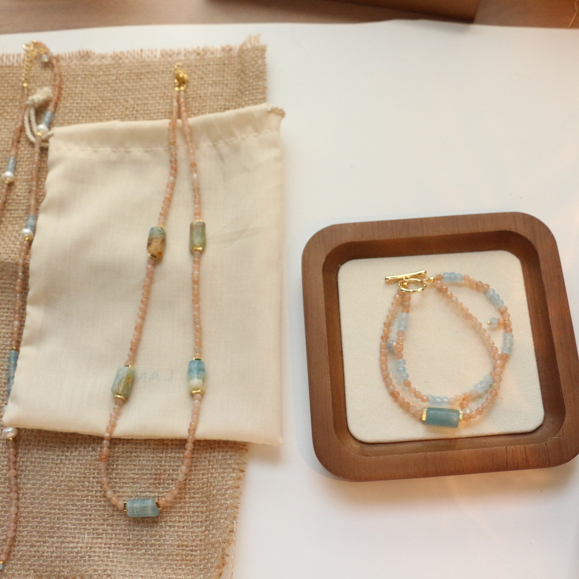 海燕サイダー色ブルー方解石天然石ネックレスブレスレット二重太陽石ビーズアクセサリー女の子
