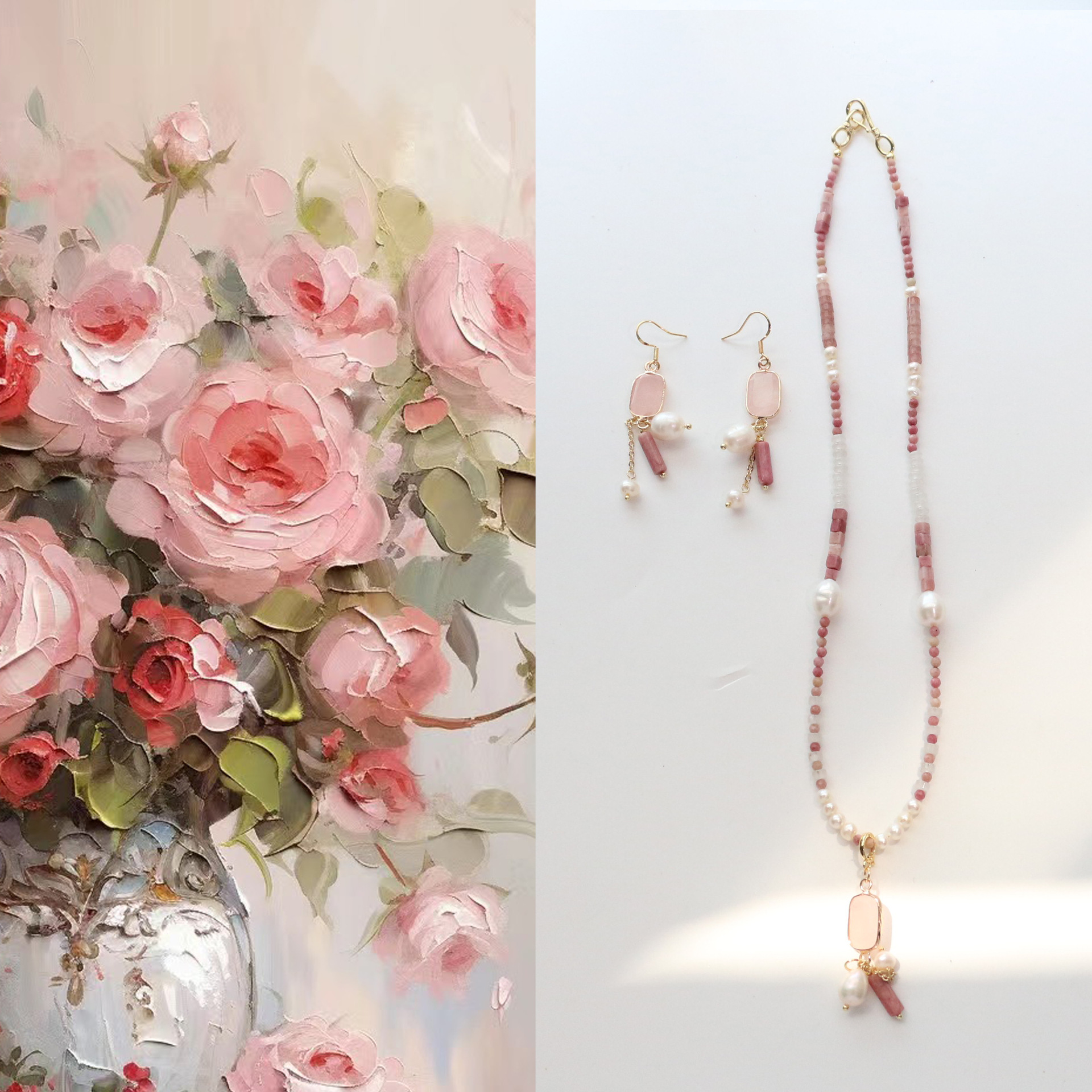 ピンクの小衆軽豪華レトロ天然石赤紋石いちご結晶長ネックレスオリジナルデザイン創意ビーズチェーン