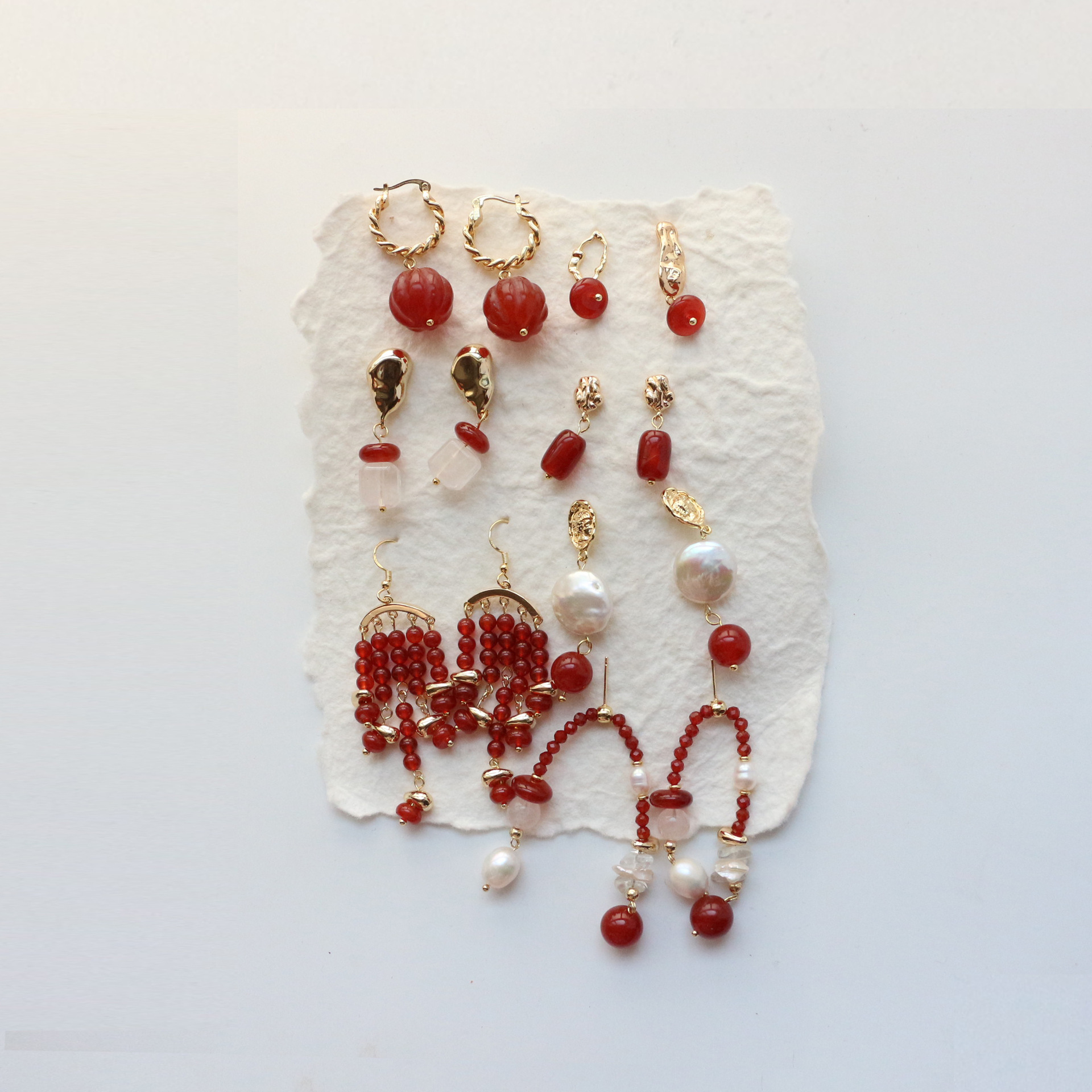 7a級の赤い瑪瑙の新年の赤い本命年の赤いイヤリングの天然石の白い水晶のピアスの手作りの耳飾りの包みの金の保色