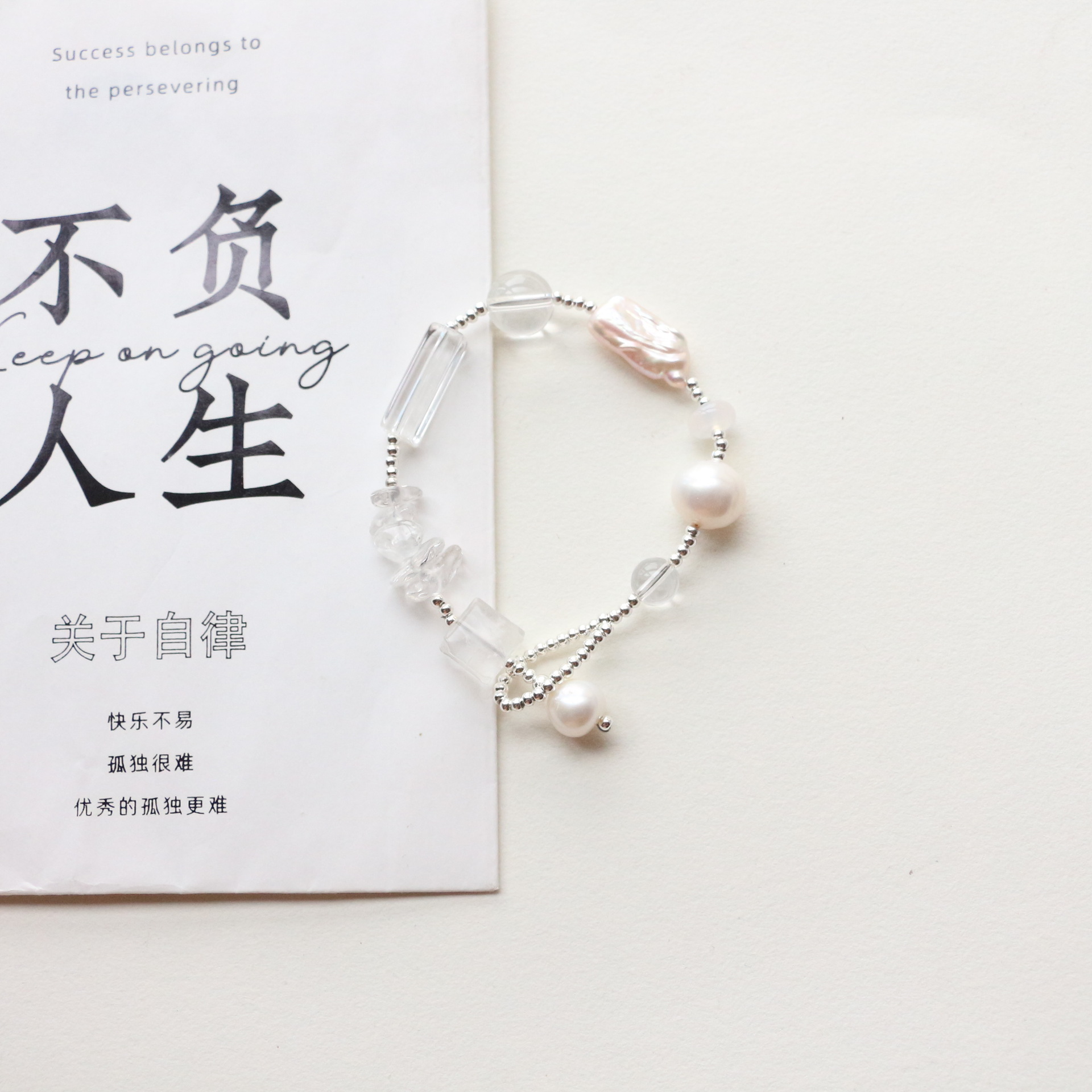 ナチュラルホワイトクリスタル シンプルブレスレット 天然淡水パール ビーズブレスレット バックルタイプ 手首周り 15に最適