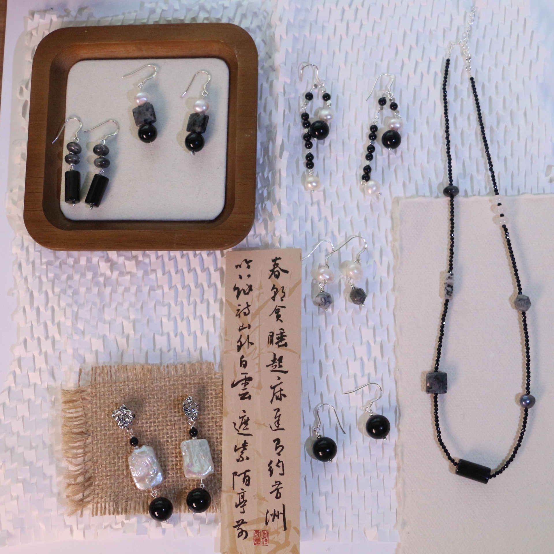 新中国式天然石淡水真珠925銀イヤリング耳フック水墨白黒灰調瑪瑙イヤリング