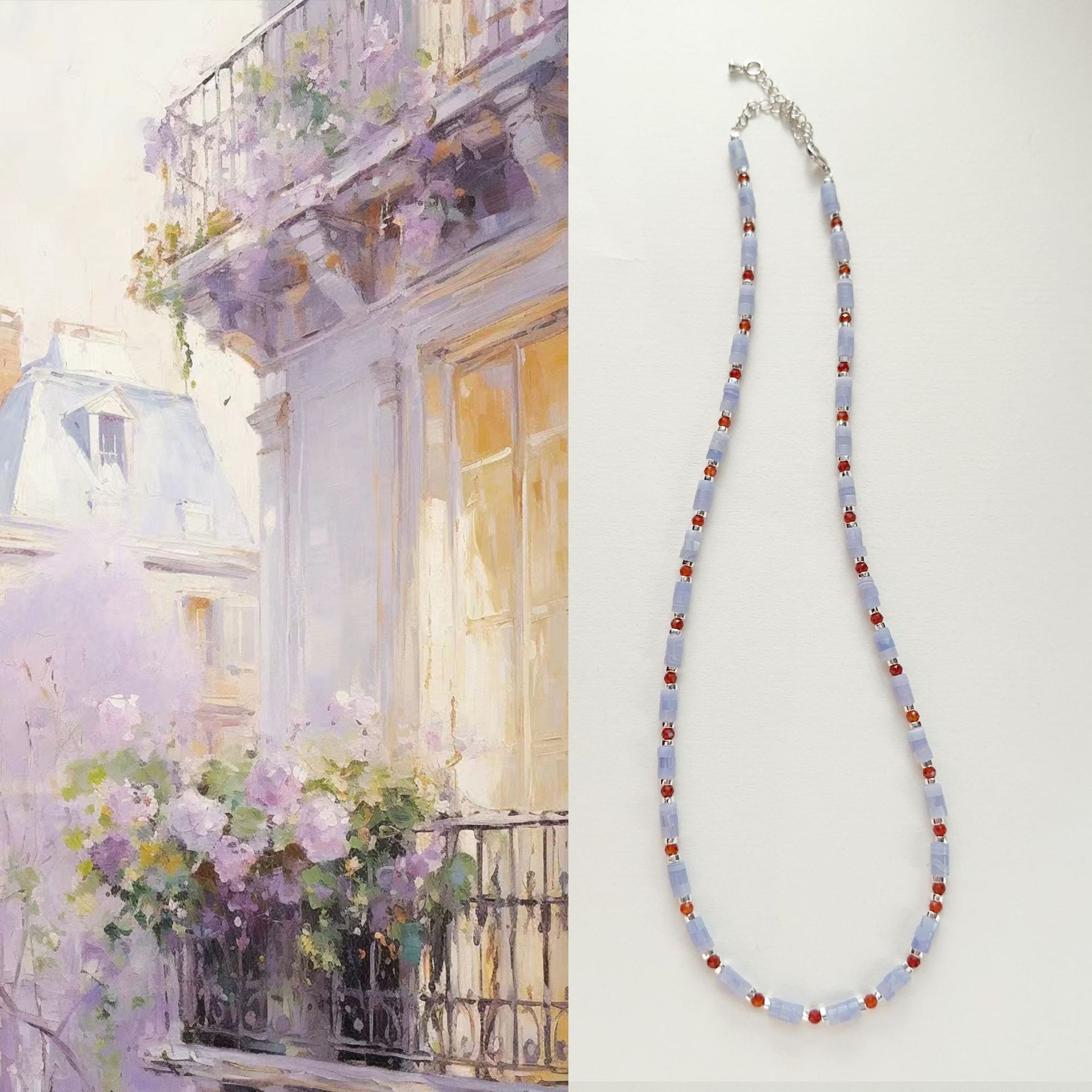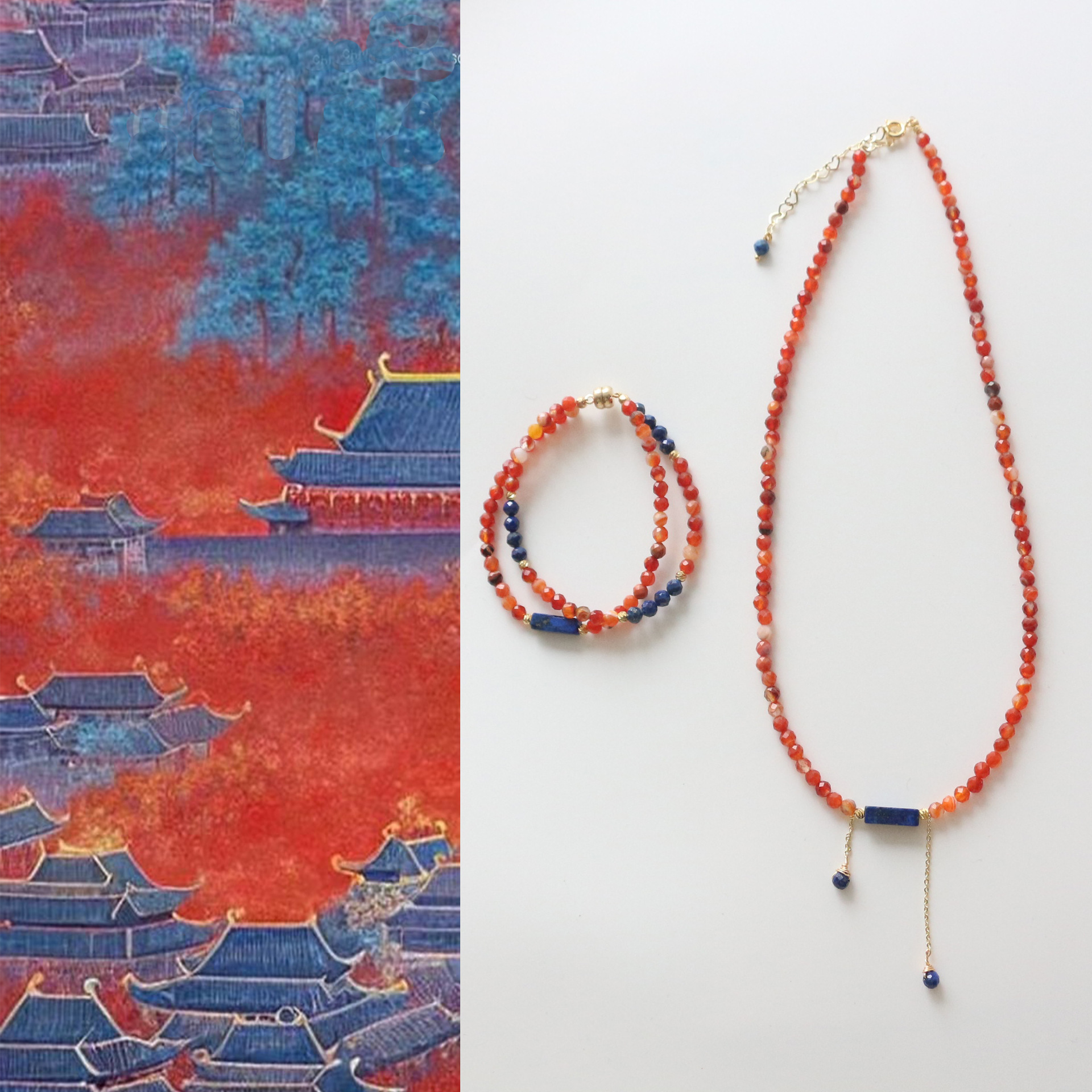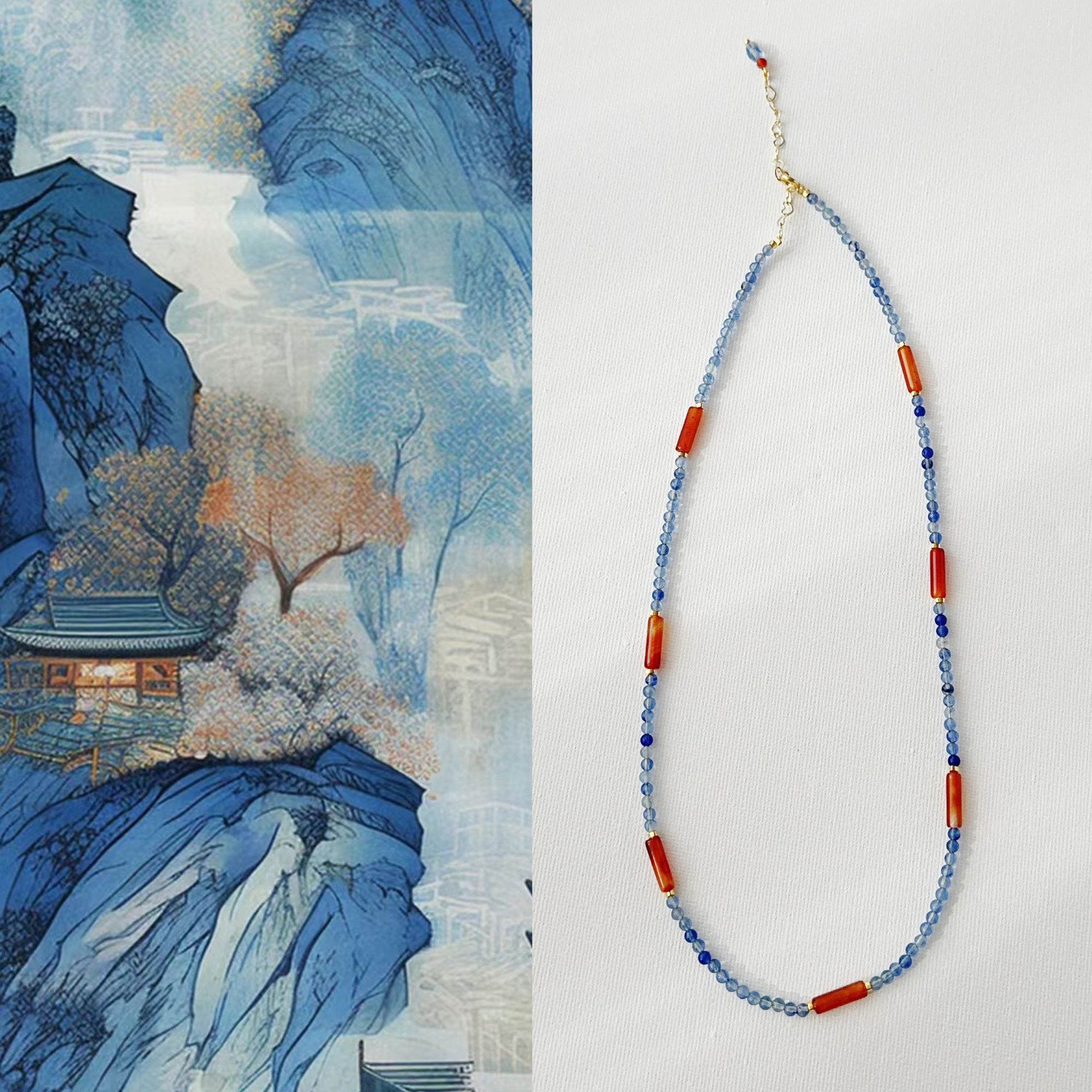 天然石ビーズネックレス首チェーン手作りオリジナル小衆アクセサリー青オレンジ色水墨山水国風首チェーン