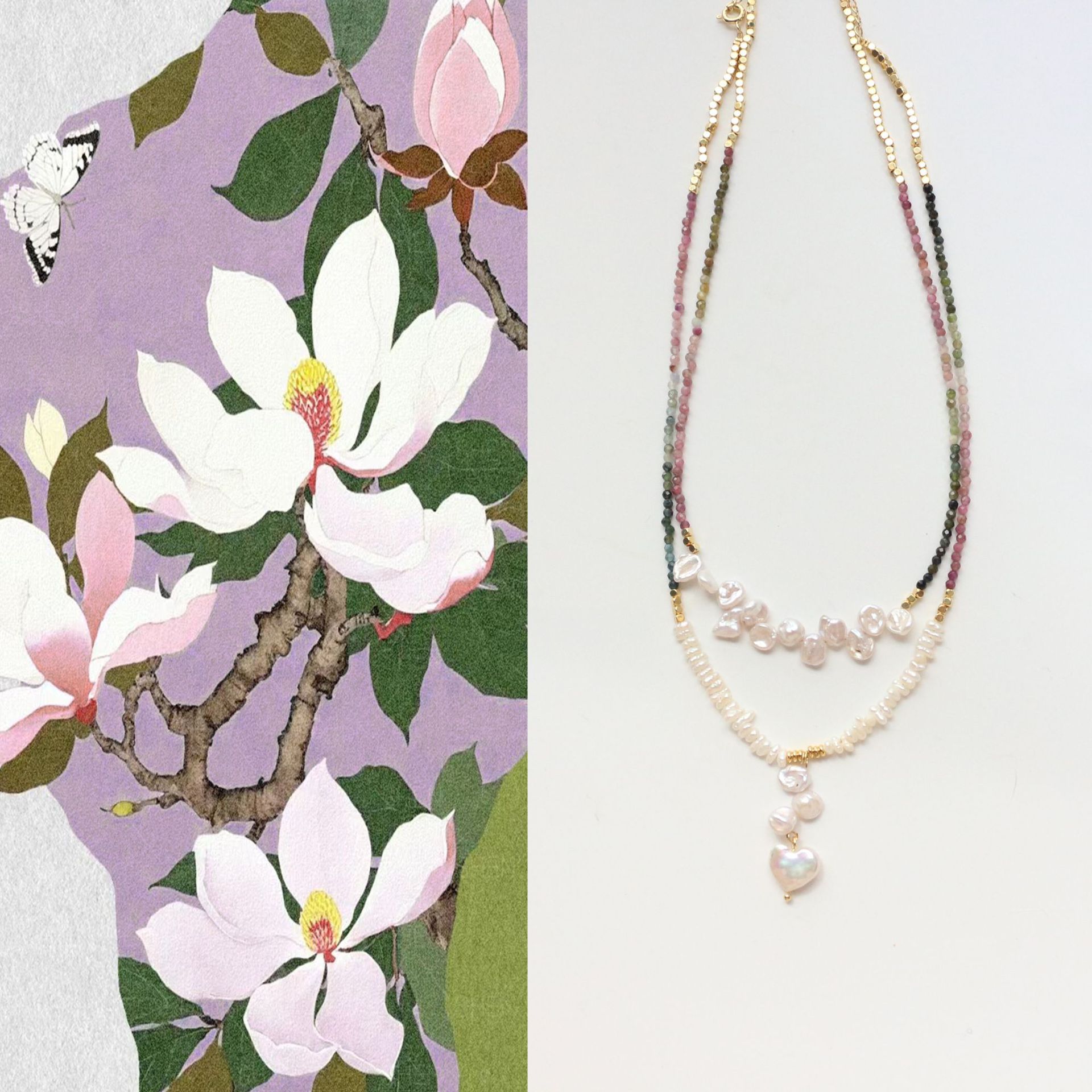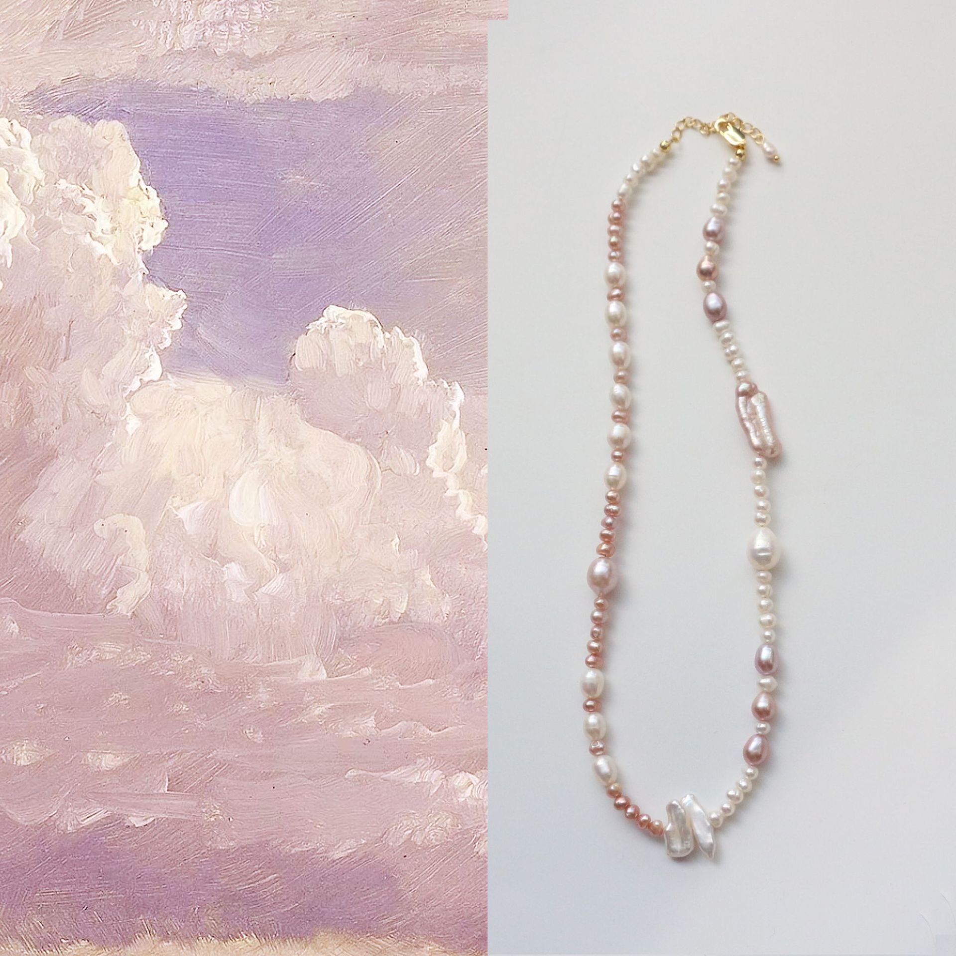 オリジナルデザイン ピンク ブルー ライスビーズ シェルビーズ ミックスカラー クリームカラーマッチング ネックレス ブレスレット セット ネックレス