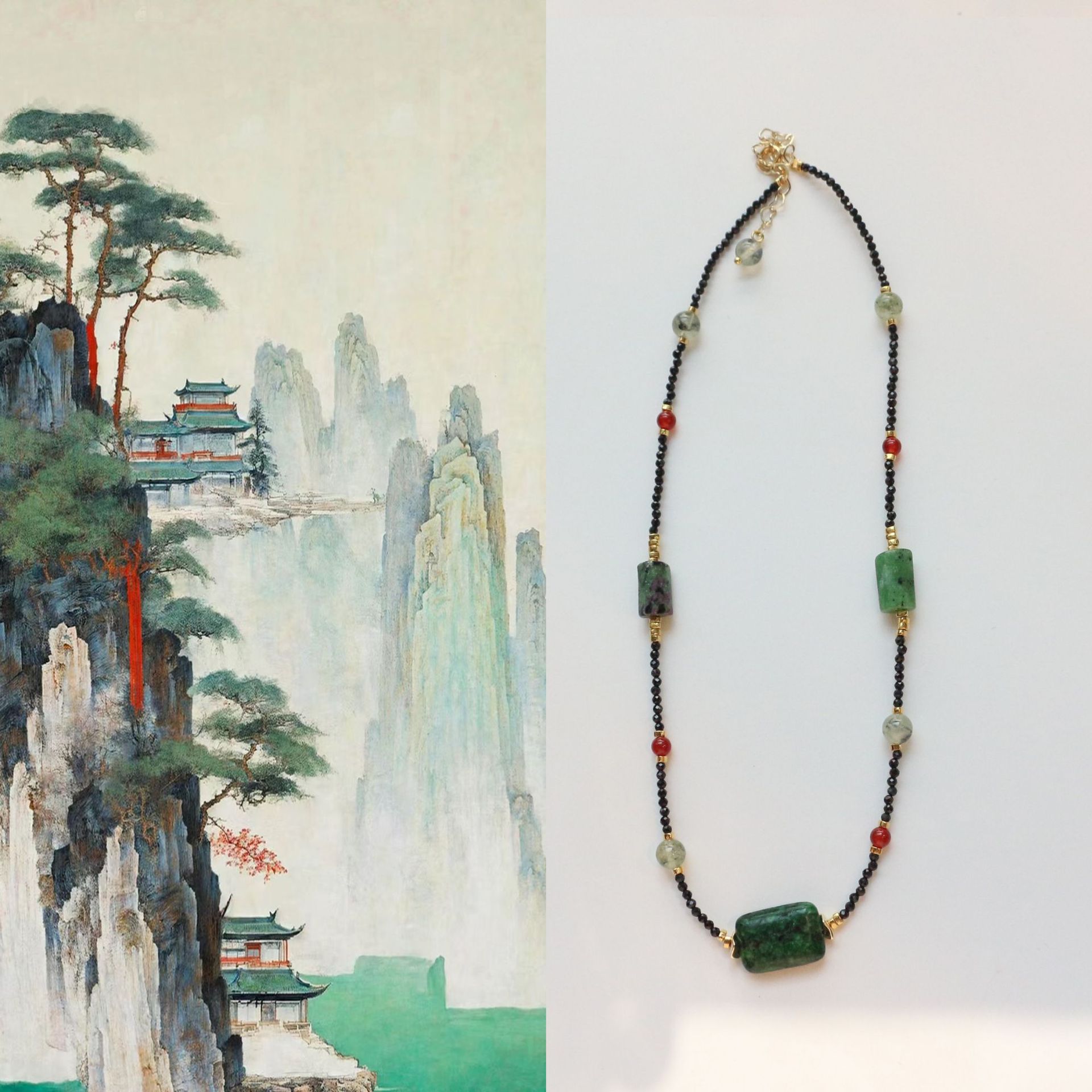オリジナルデザイン国風天然石赤緑ネックレス鎖鎖ビーズネックレス