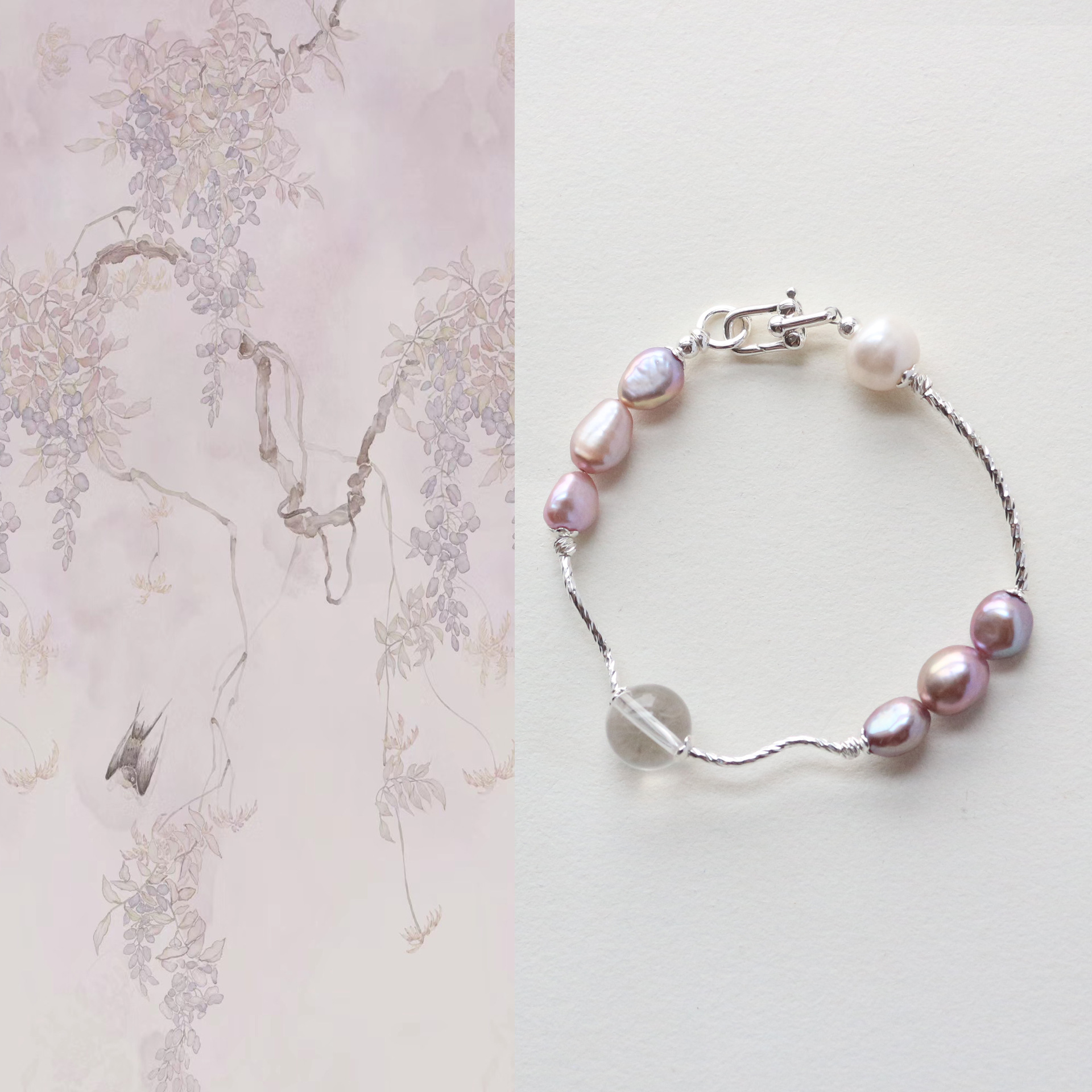 オリジナルデザインピンクパープルパールブレスレットホワイトクリスタルブレスレットガールピンク淡水バロックパール