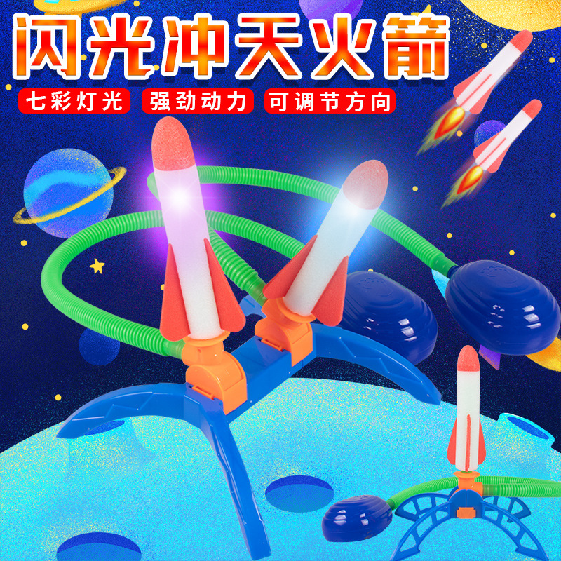 子供の足は大きいサイズの天を突くロケットを踏んで屋外で発光します。
