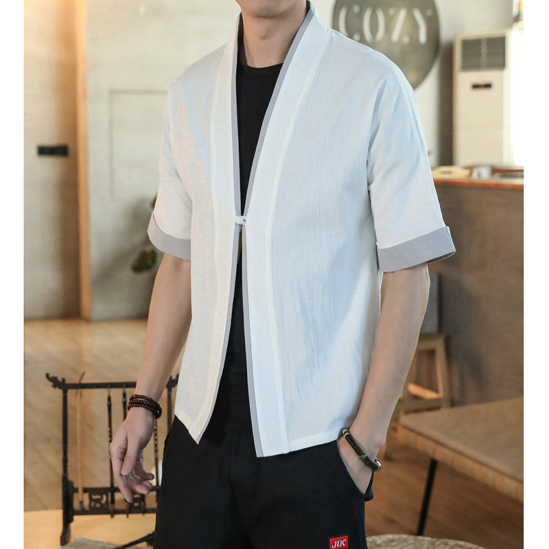 夏の中国風新型男性式七分袖カーディガン純色漢服レトロ大サイズ道着ゆるい亜麻シャツ
