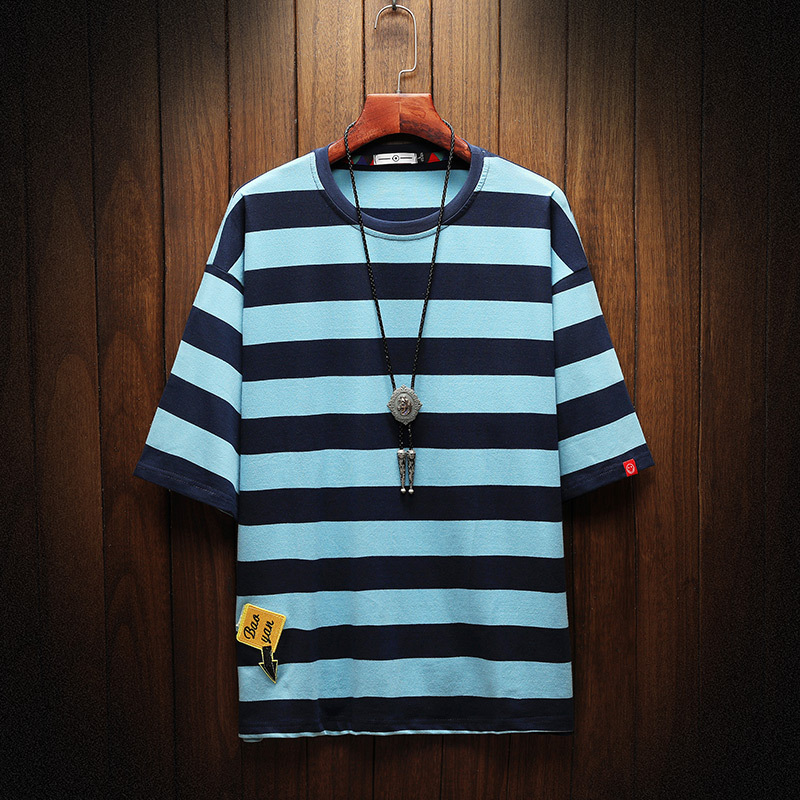 日系夏の新型青少年ゆるい縞半袖tシャツファッション大サイズ男性カジュアル半袖tシャツ