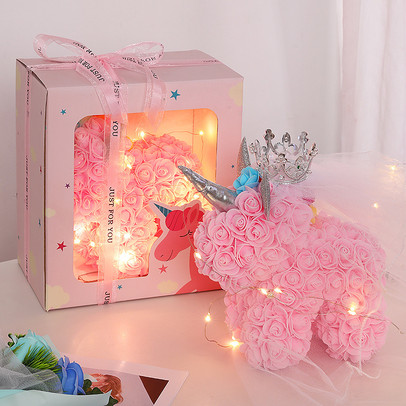 不滅の花、ユニコーンフォームフラワー、ウェディングドレス、ローズベア、ガールフレンドへの新年の贈り物、中国のバレンタインデーの小さなギフトブーケ