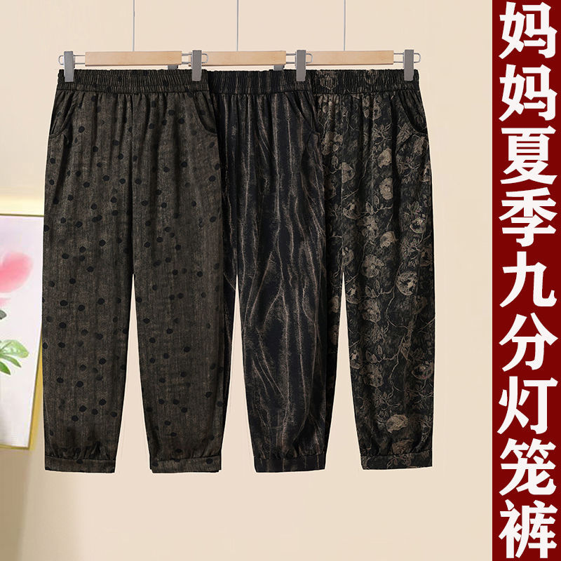 大きいサイズの女性の氷の糸のしわの夏のお母さんのズボンのカジュアルな百合のハーレムのズボンは腰のダイコンのズボンのゆったりしている9分のズボンを締めます。