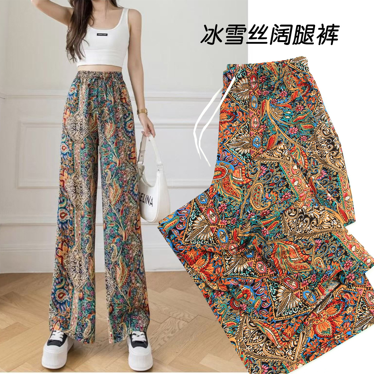 ポケット付きアイスシルクワイドレッグパンツ、女性用夏の痩身ルーズ大きいサイズストレートカジュアルパンツ、防蚊クールフラワーパンツ