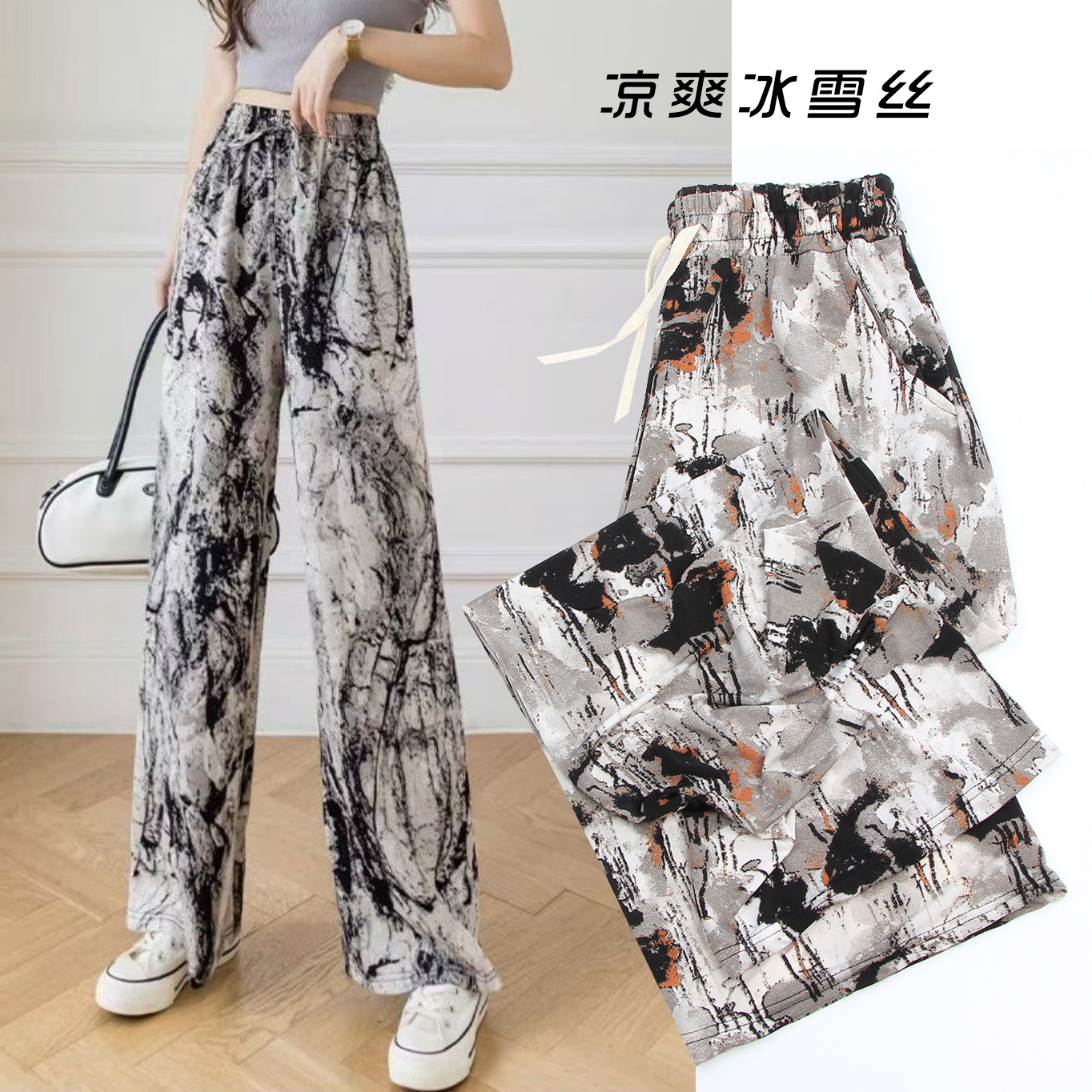水墨画縦縞氷天糸広脚ズボン女夏ゆるい涼しい日焼け止め蚊垂れ感モップストレートカジュアルパンツ