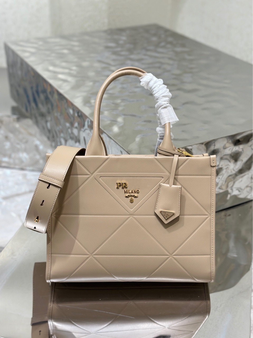 P's 23 新製品メタルロゴ三角柄本革 ote ショッピングバッグショルダーハンドヘルドレディースバッグ 1BA379