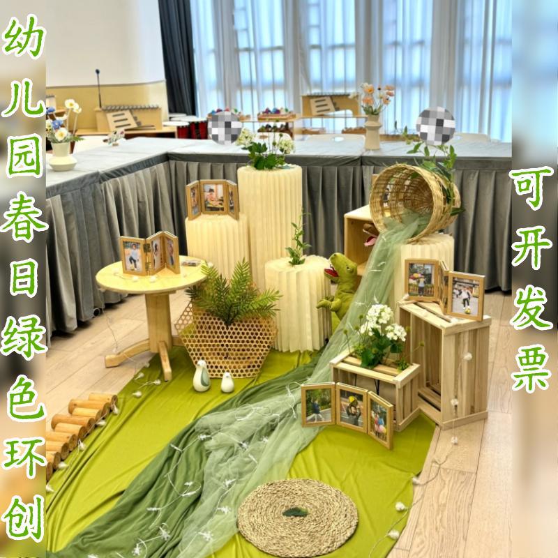春の幼稚園の森系自然テーマ環創紗幕春日学校ホールの緑の雰囲気シーンの配置
