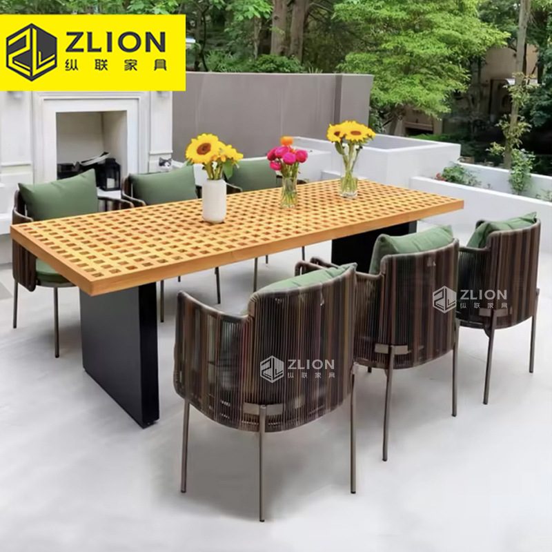 高級チーク材屋外ヴィラテーブルと椅子中庭B&B籐織りチーク家具ガーデンテラス無垢材テーブルと椅子セット