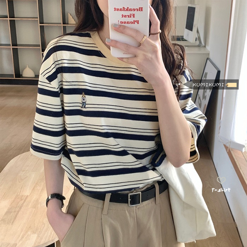 ストライプ半袖Tシャツレディース夏韓国風デザインニッチルーズインナートップ