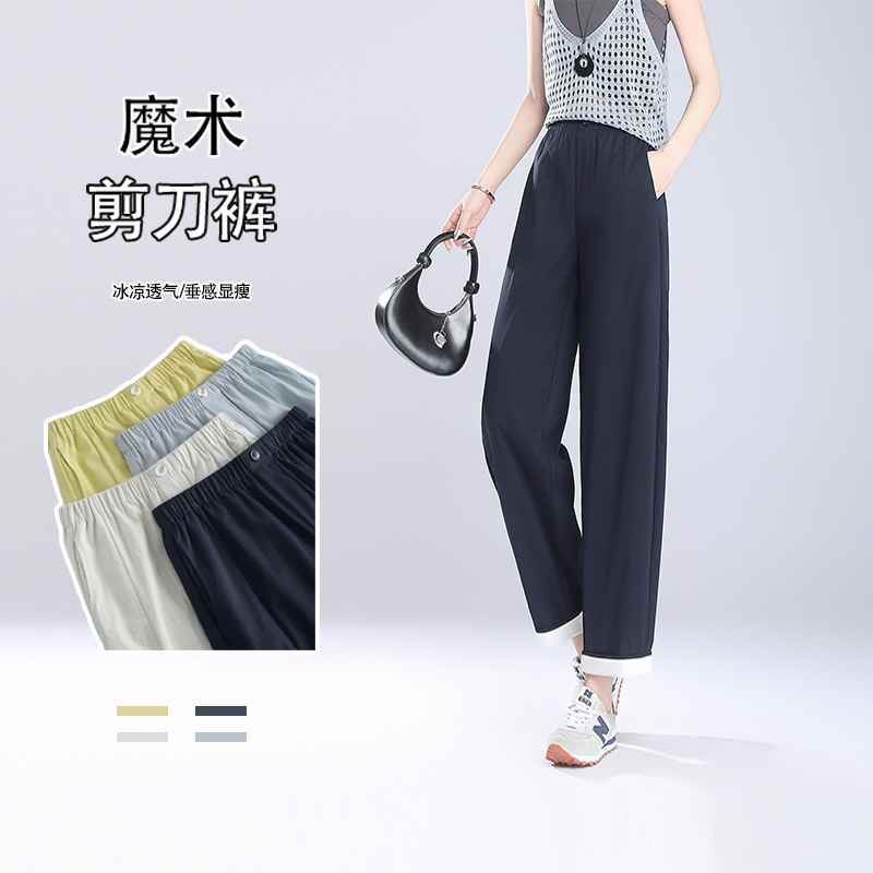 夏和風マジックはさみパンツ薄いストレートアイスシルクパンツ女性のカジュアル防蚊パンツ在庫卸売脚長