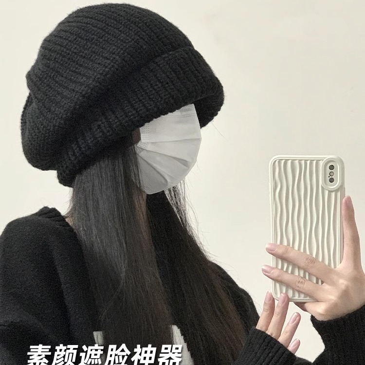 帽子の冬の女性2024の新型のニットの毛糸の帽子の韓国版のすっぴんの顔は顔の小さい包みの帽子の大きい頭の周りの潮を現します。