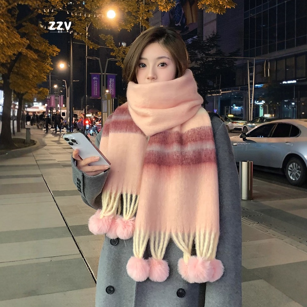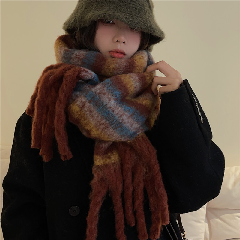 雰囲気感虹毛流蘇マフラー保温マフラー馬海毛厚手カラーストライプストールカップル冬