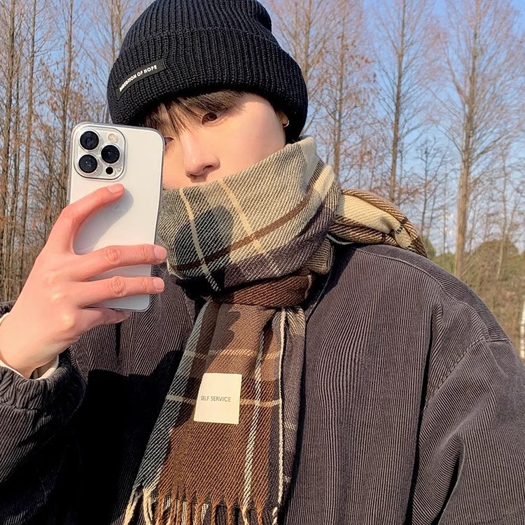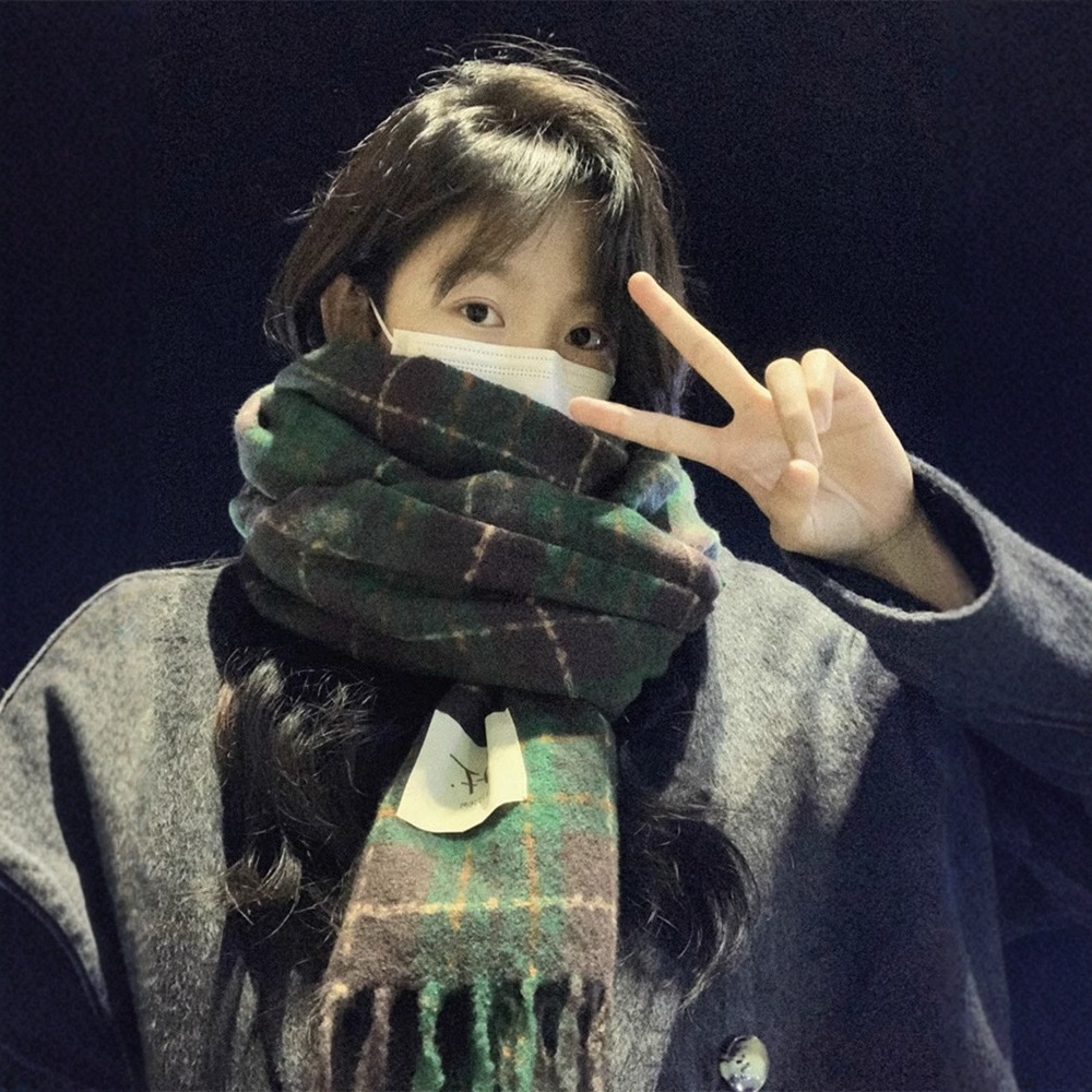 2023新型マフラー女性秋冬韓国版百合日系格子カーキ色保温格子縞マフラー高級感