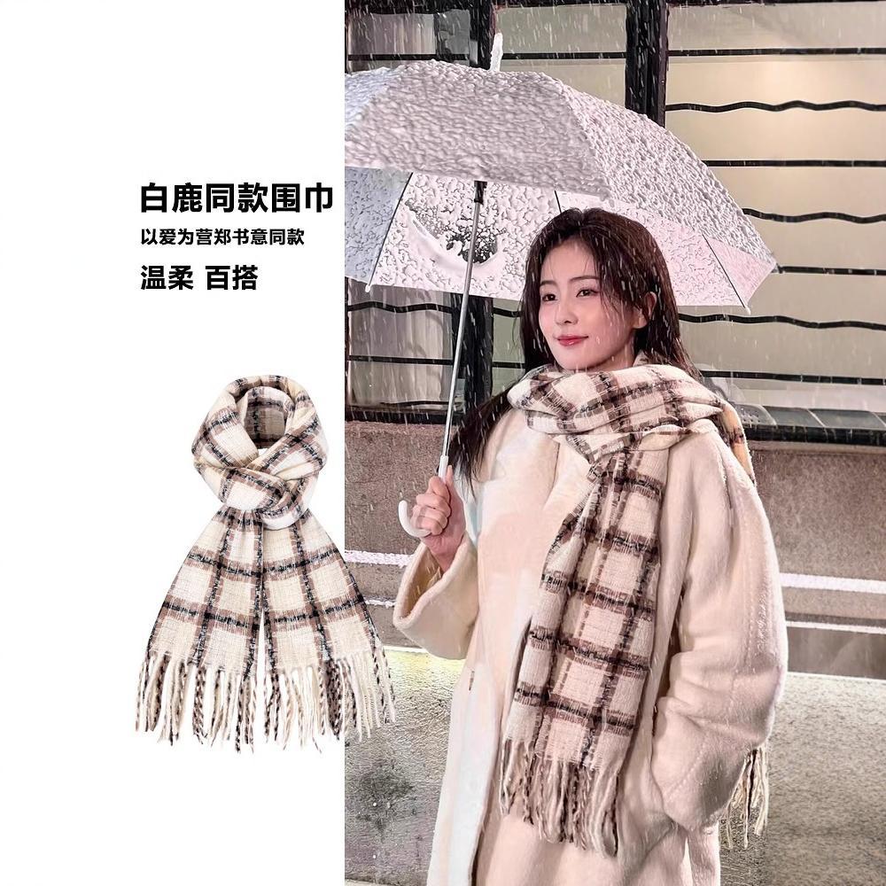 白鹿の同じ格子のマフラーの女性は秋冬にマントを厚くします。