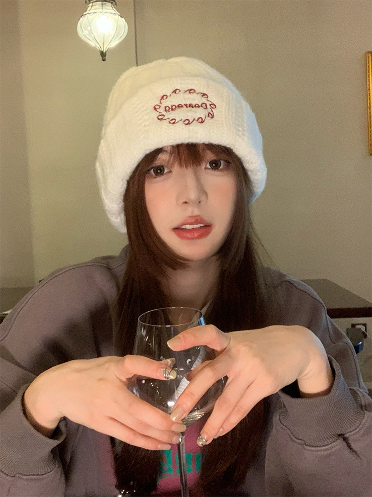 白い文字の刺繍の毛糸の帽子の女性の秋冬の厚い保温の耳の帽子は顔の小さいニットの帽子の大きい頭の周りを現します。