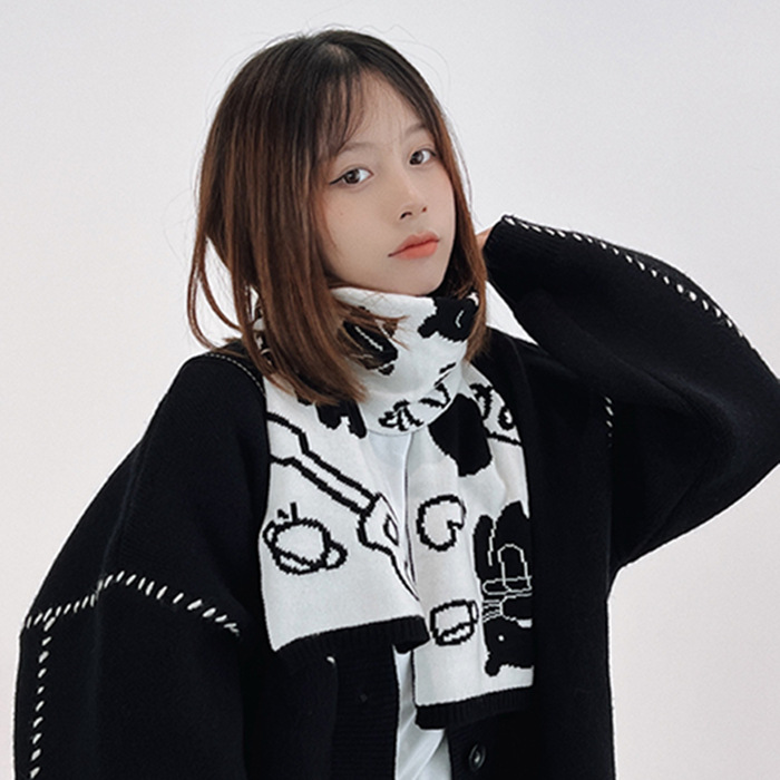 Ins漫画の図案の両面の小さいマフラーの女性の秋冬の韓国版の学院の風のメリヤスの保温の百合のマフラーの学生