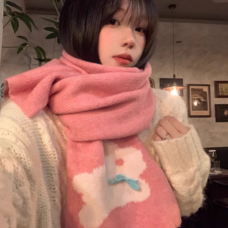 2024新型カップルマフラー女性秋冬百合日系韓国版白いニット毛糸マフラー男性ファッションかわいい