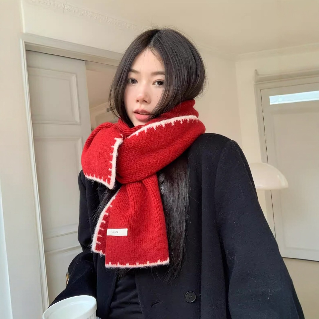2024新型韓国版衝突色縞ウール混紡ソフトマフラー女性秋冬保温百合ニットマフラー