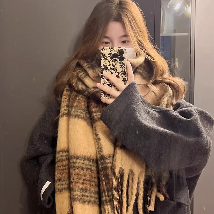 マフラー冬の女性高級感2023新型白黒格子馬海毛百合学生は保温してマフラーの潮を厚くする
