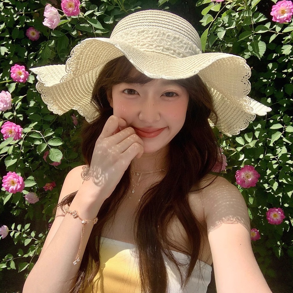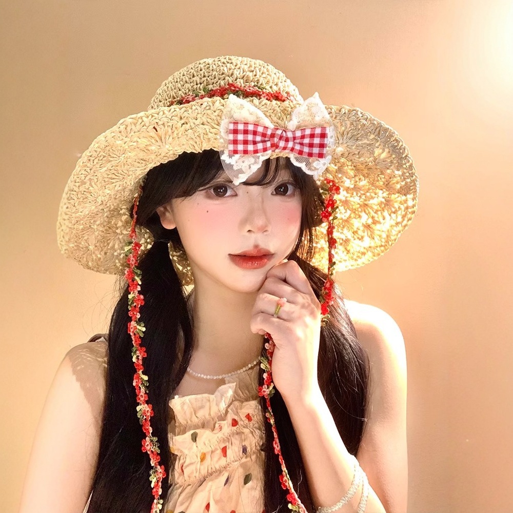 フレンチレースリボン麦わら帽子女性のための夏甘くてかわいい海辺ビーチ休暇大きなつば日焼け止め帽子