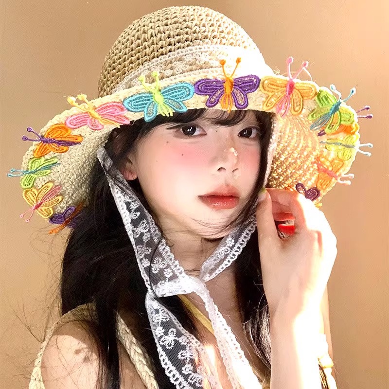 カラフルな蝶ストリーマー麦わら帽子女性のための 2025 新しい牧歌的なスタイルの夏の海辺の休暇サンシェード大きなつば日焼け止め帽子