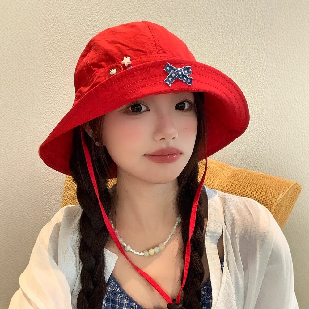 かわいい赤い蝶結びのボタンの速乾漁師の帽子の女性の夏の薄いタイプの通気性のつばの盆の帽子の日よけの日焼け止めの帽子
