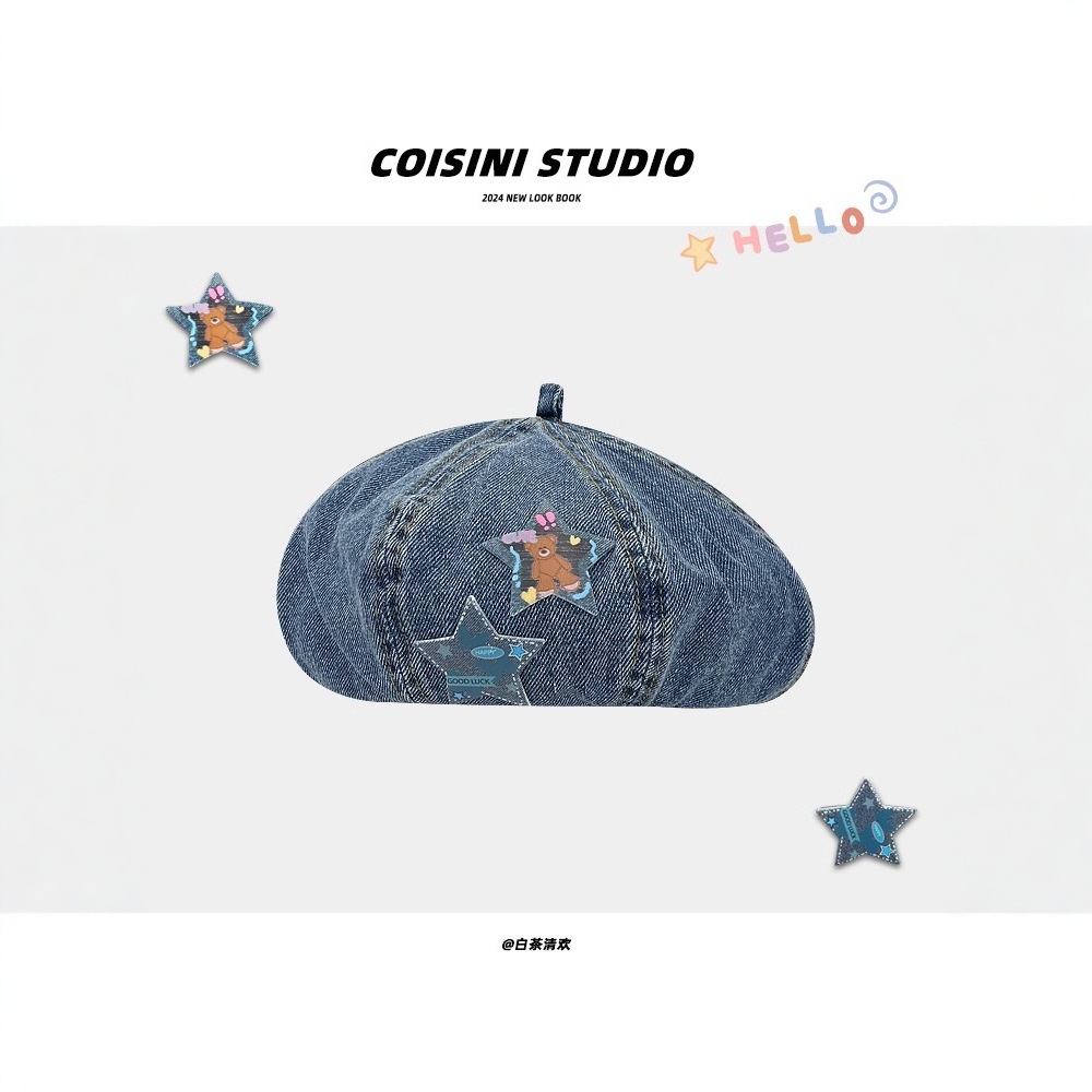 韓系は古い水洗いデニムのベレー帽を作っています。
