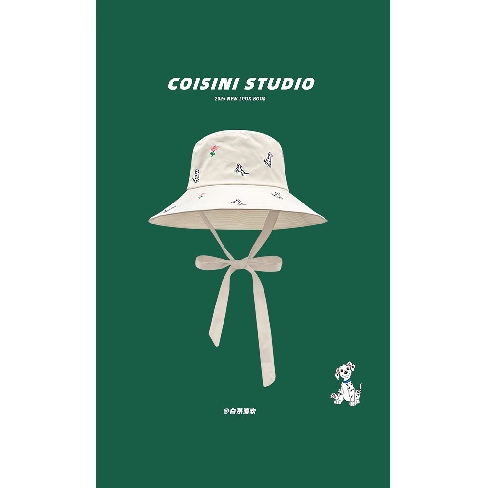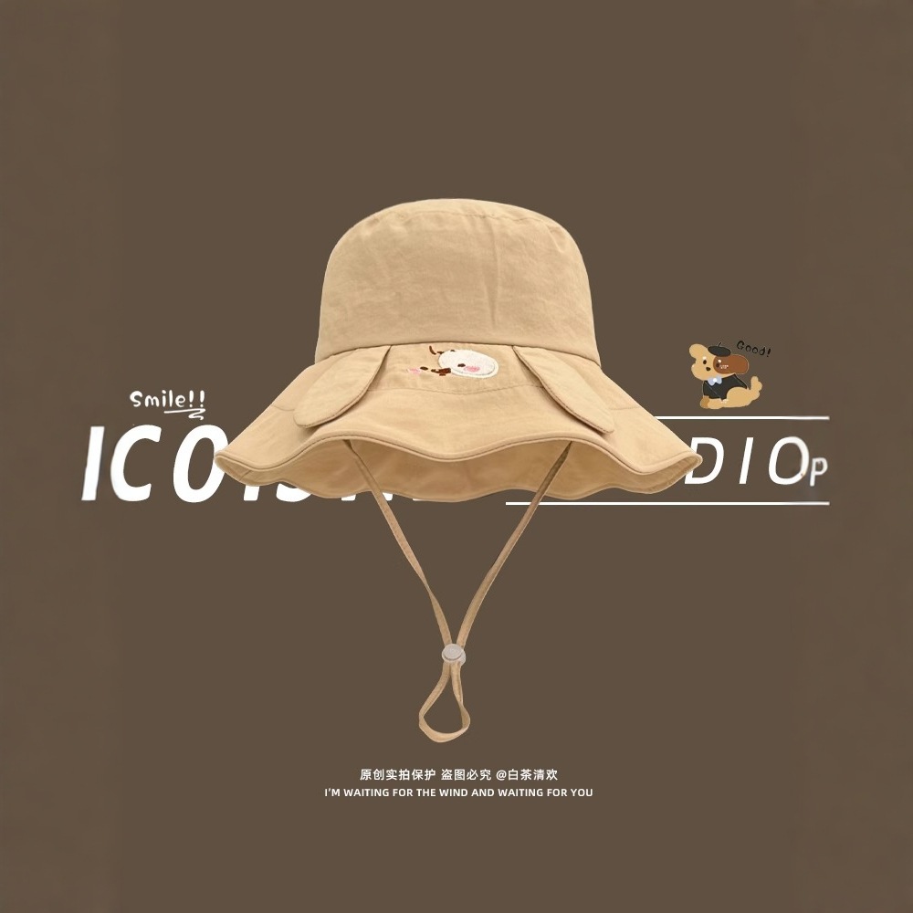 2025新型のかわいい斑点の犬の刺繍の大きい軒の漁師の帽子の子供の夏の旅行の日よけの帯の日焼け止めの帽子の潮