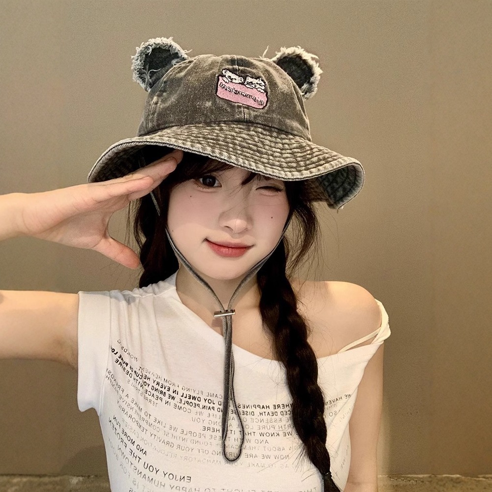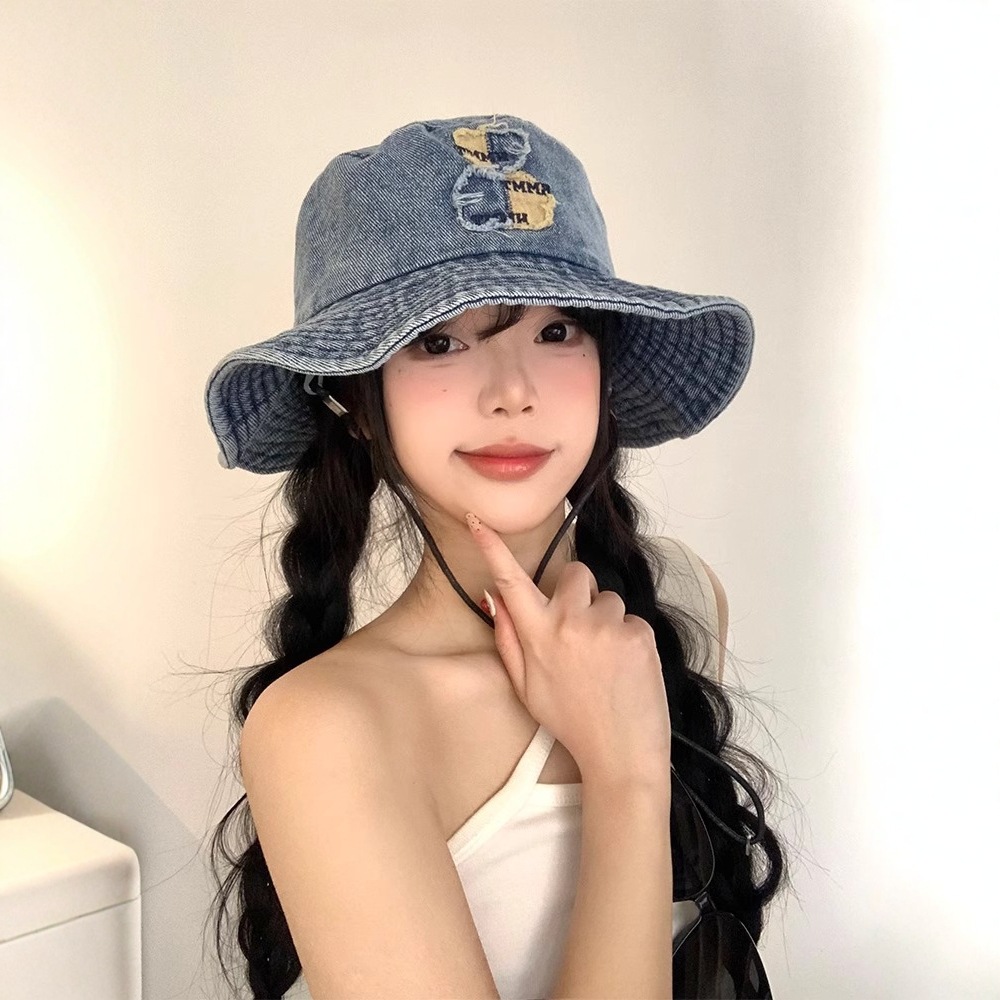 レトロな水洗いデニムの熊の漁師の帽子の女性の春の大きい頭の周りの百合の顔の小さい盆の帽子の日系のバケツの帽子