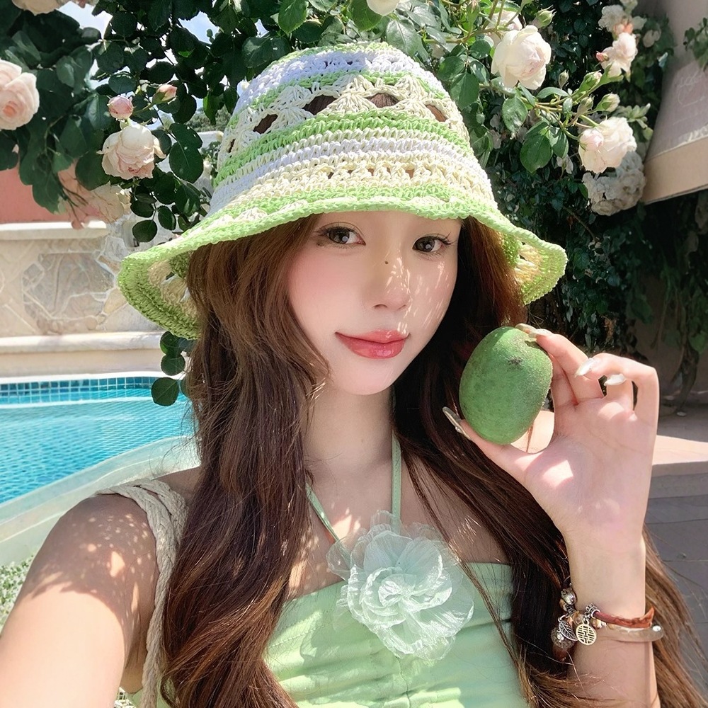 フランスの色合わせの透かし編みの麦わら帽子の女性夏の海辺の休暇の日よけの日よけの帽子の大きいつばの草は漁師の帽子を編みます。