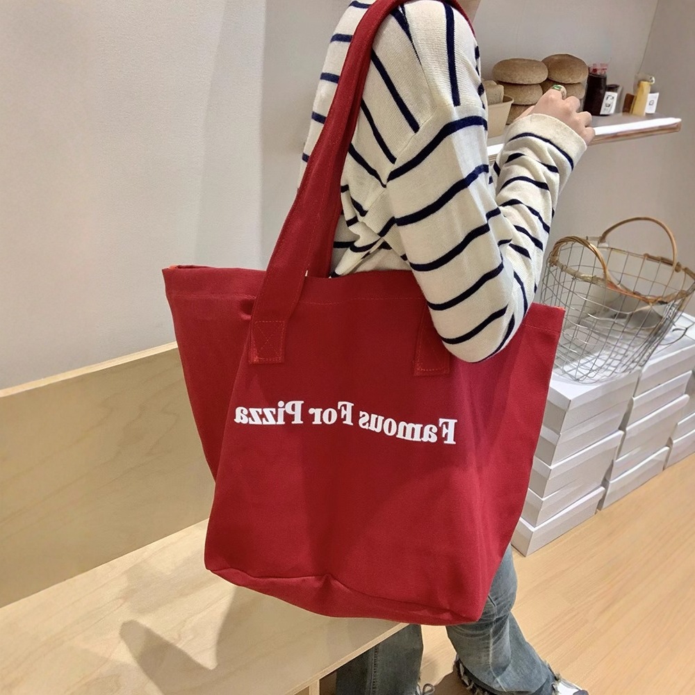 韓国版シングル肩赤いアルファベットキャンバスバッグ2025新型大容量日常通勤トートバッグ学生用ショッピングバッグ
