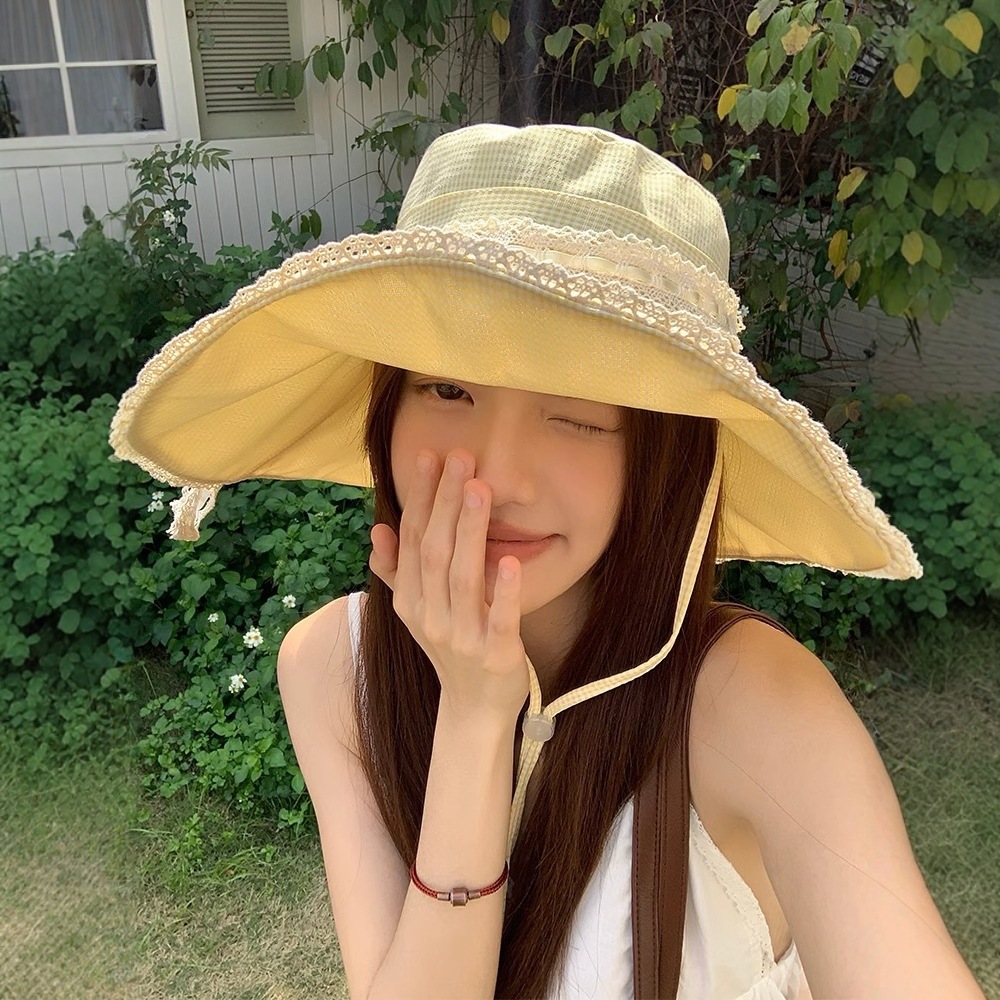 小さい清新な格子縞のレースの蝶結びの漁師の帽子の女性の春の夏の旅行の大きいつばは日よけの日焼け止めの帽子を持っています。