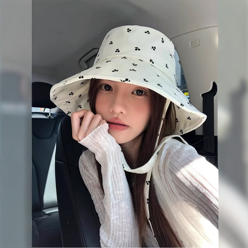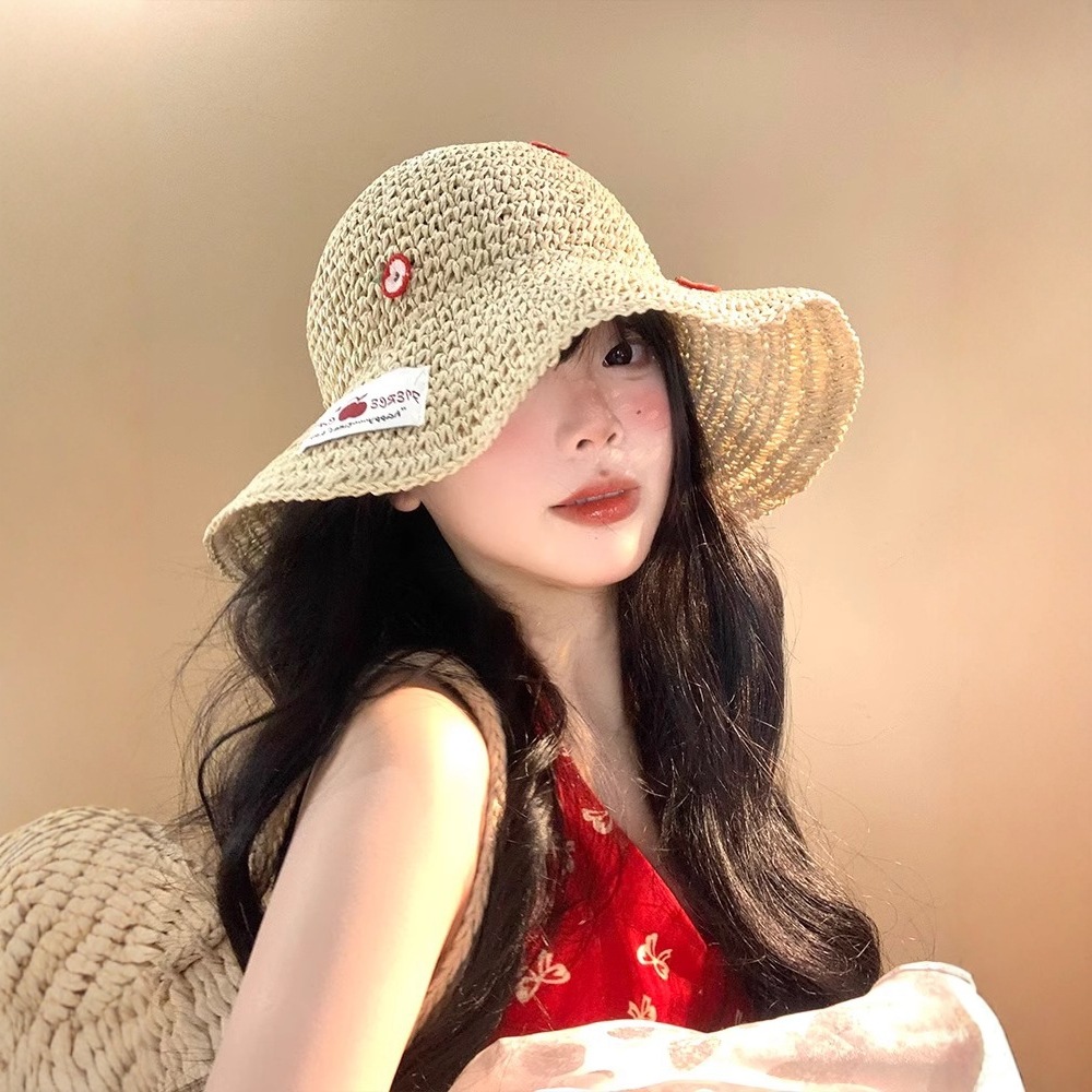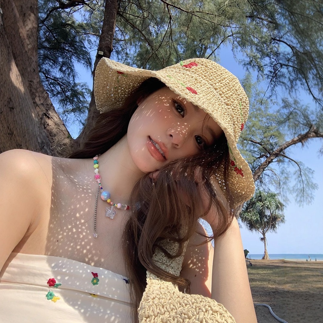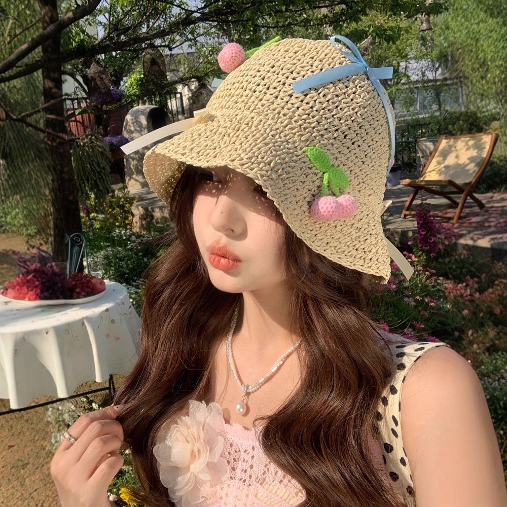 韓系insかわいいさくらんぼ愛麦わら帽子女夏の海辺で休暇を過ごす大きなつば日焼け止め草編日よけ帽子女