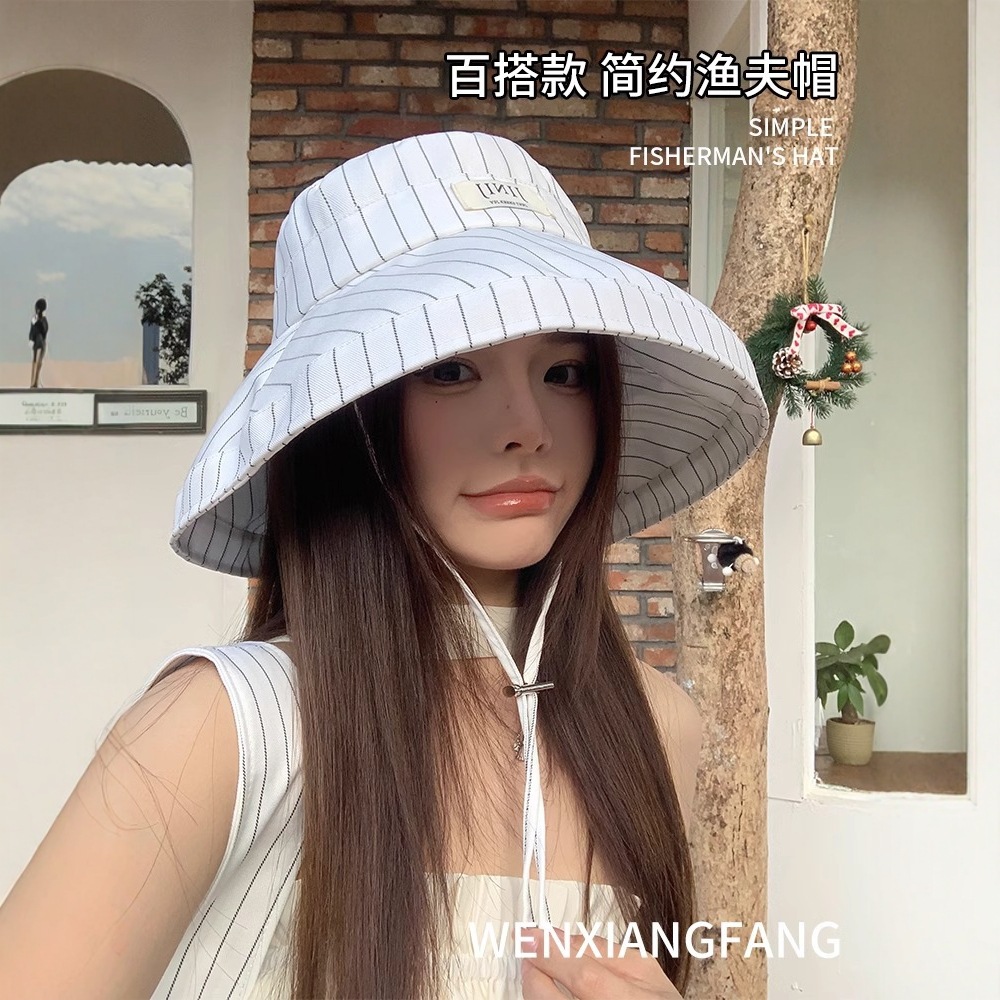 韓国系insストライプ漁師帽の子供2025年春の新型の大きなつばには、日よけ付きの日焼け止め盆帽がついています。